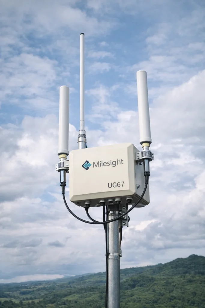 To solve this challenge, we implemented a private LoRaWAN tower network using industrial grade gateways and high gain antennas. For this project, a Milesight UG67 antenna was installed.This infrastructure provides long range coverage, secure communication, and full network control.