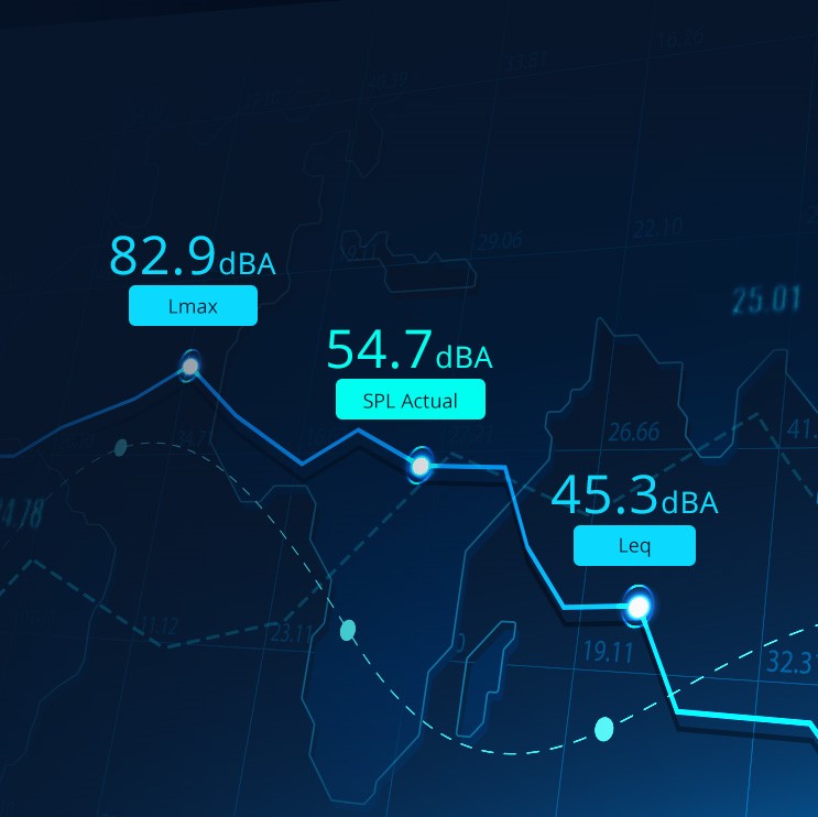 Available measurement units include Actual SPL, Leq, and Lmax, providing comprehensive acoustic monitoring.