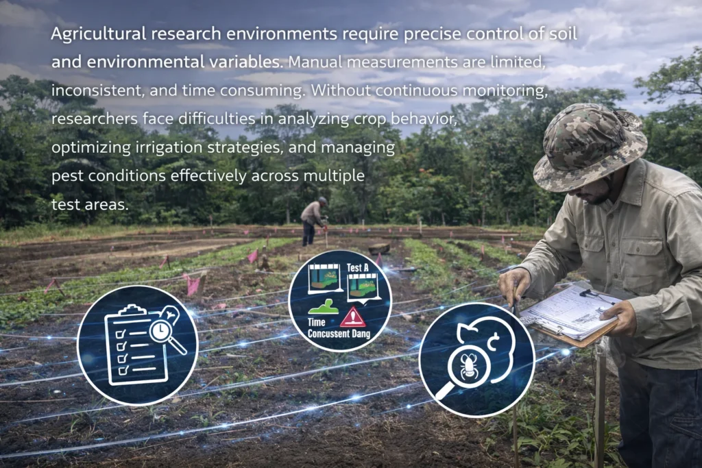 Agricultural research environments require precise control of soil and environmental variables. Manual measurements are limited, inconsistent, and time consuming. Without continuous monitoring, researchers face difficulties in analyzing crop behavior, optimizing irrigation strategies, and managing pest conditions effectively across multiple test areas.